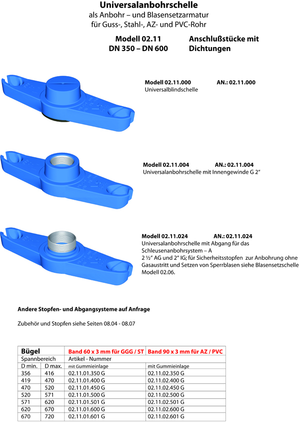 Universal service clamp UNI - AS as a tapping and stopper key setting fitting for cast iron, steel, AC/FC and PVC pipes
